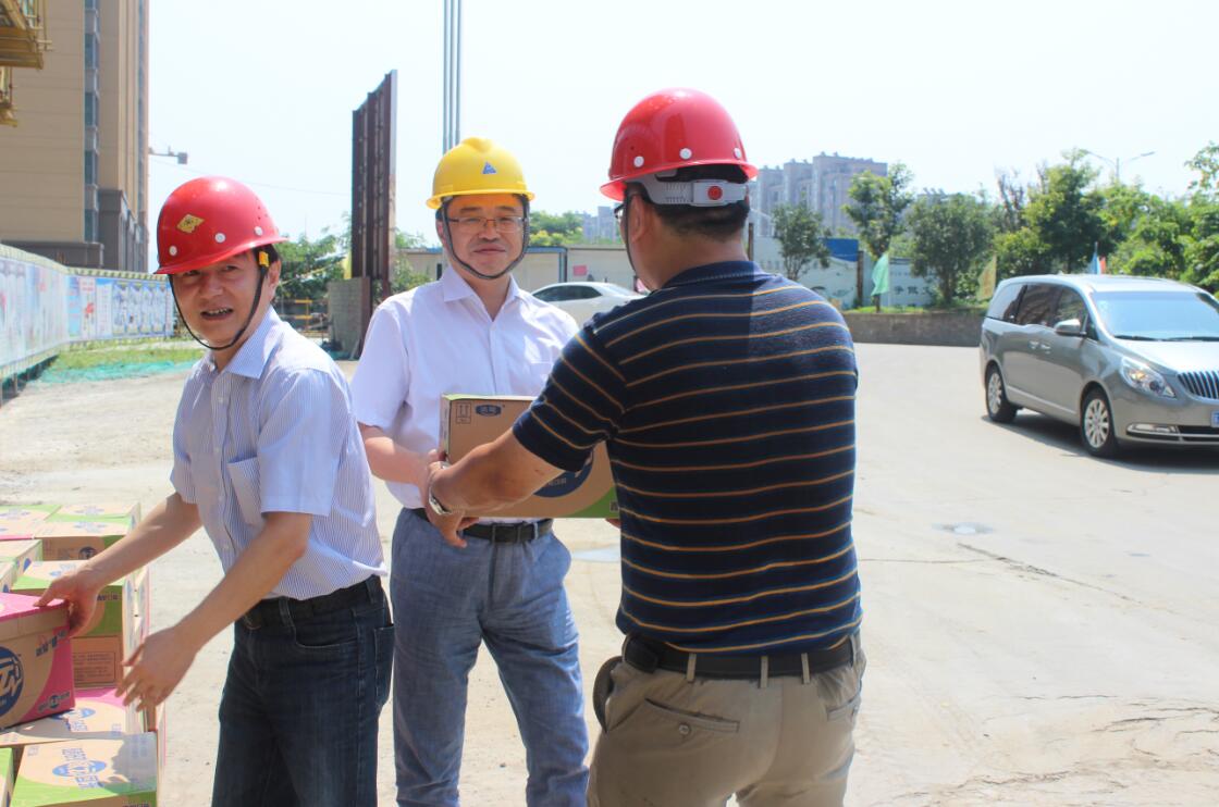 根據控股集團上半年經濟工作會議精神,按照建設集團黨委的統一部署,7月29日上午,建設集團董事長、黨委副書記周君,總經理、黨委副書記孫新山,副總經理張鋼平一行赴溧水愛濤置地公司,慰問奮戰在施工現場的一線職工,并發放防暑降溫飲品,為廣大職工“送清涼”。 周君指出,當前正值酷暑時節,置地公司并監理單位、施工單位要合理安排作息時間,將安全管理責任層層落實到一線,落實到人頭,切實做好防暑降溫各項工作,確保平安度夏。